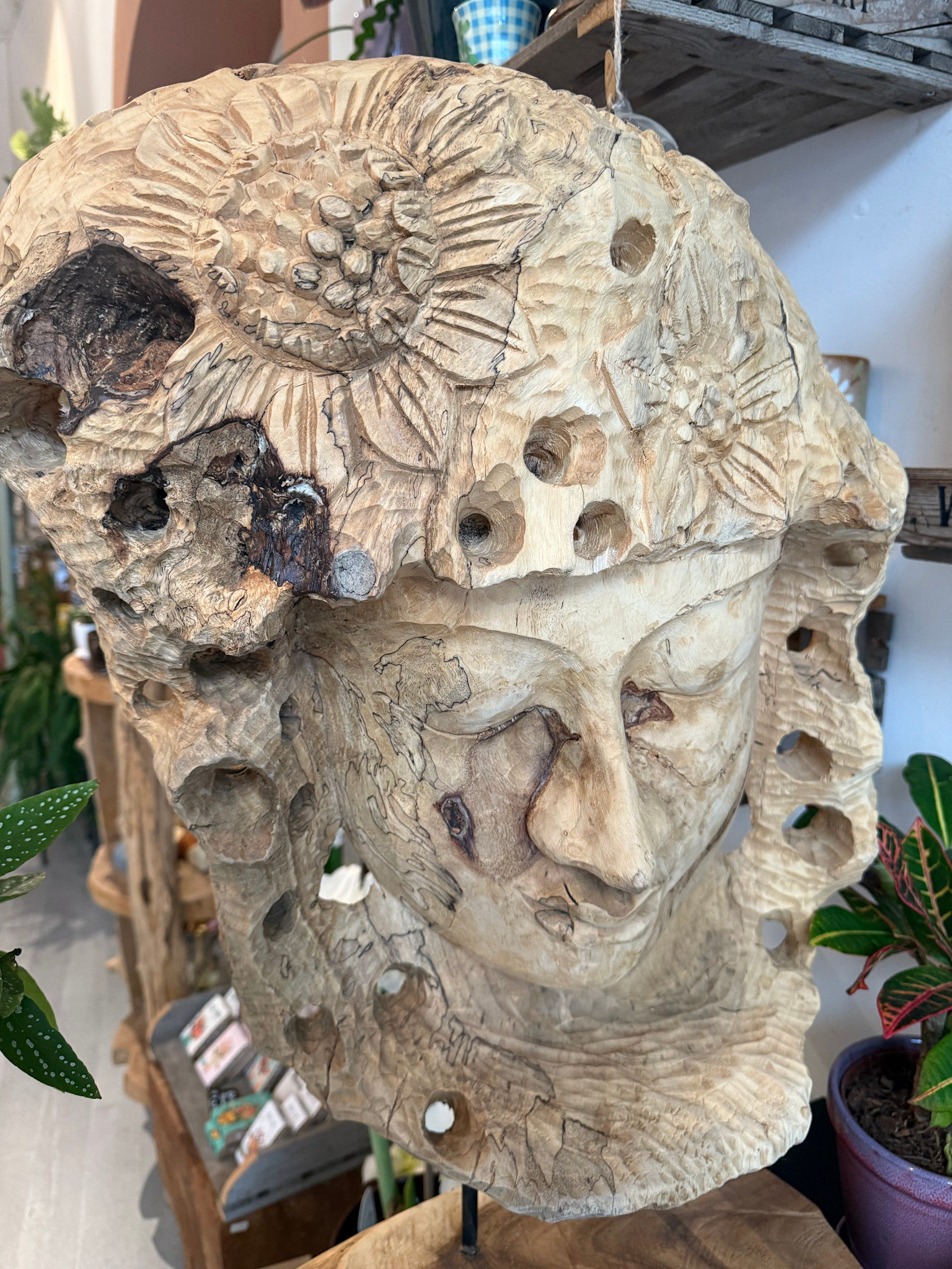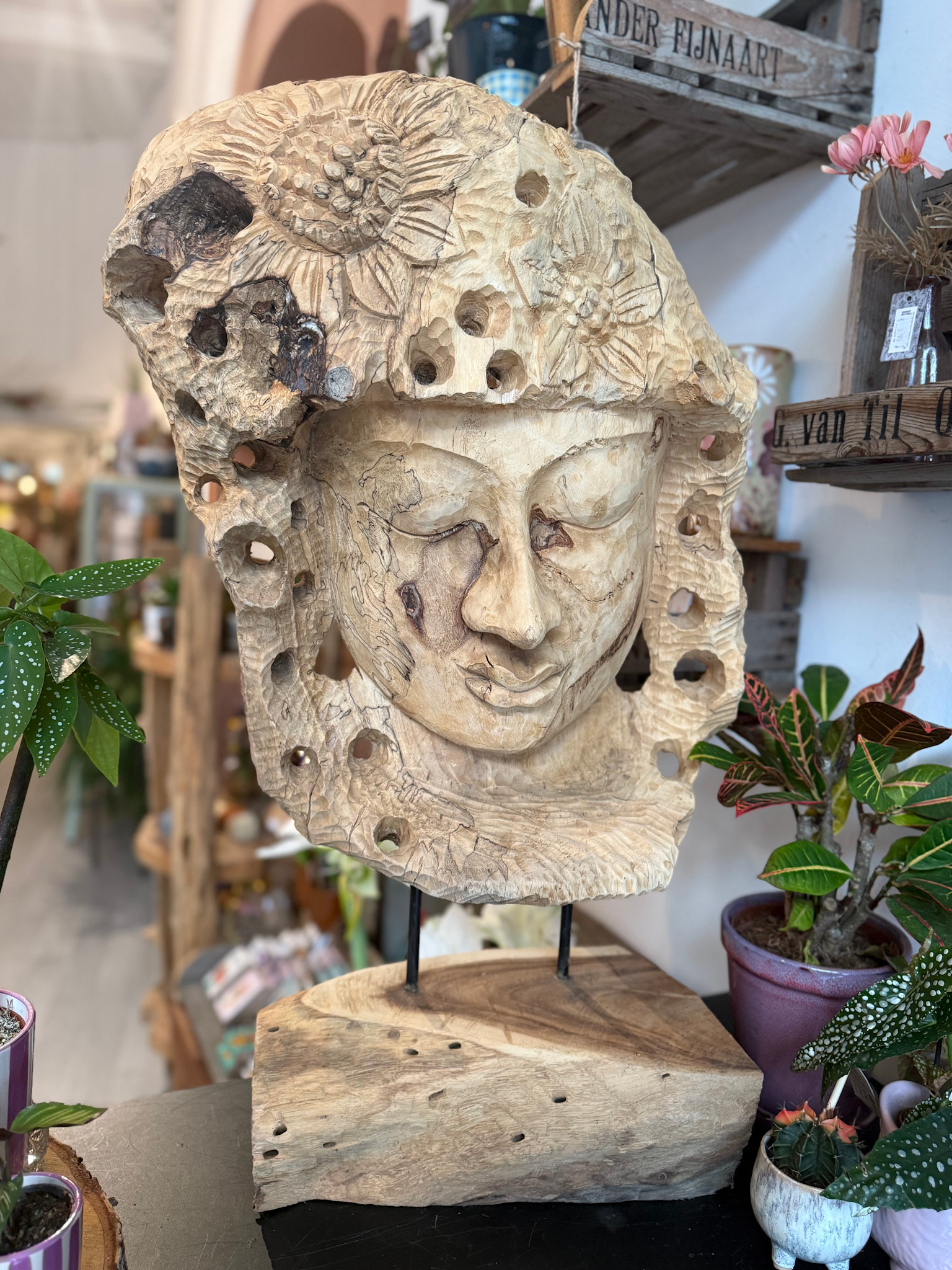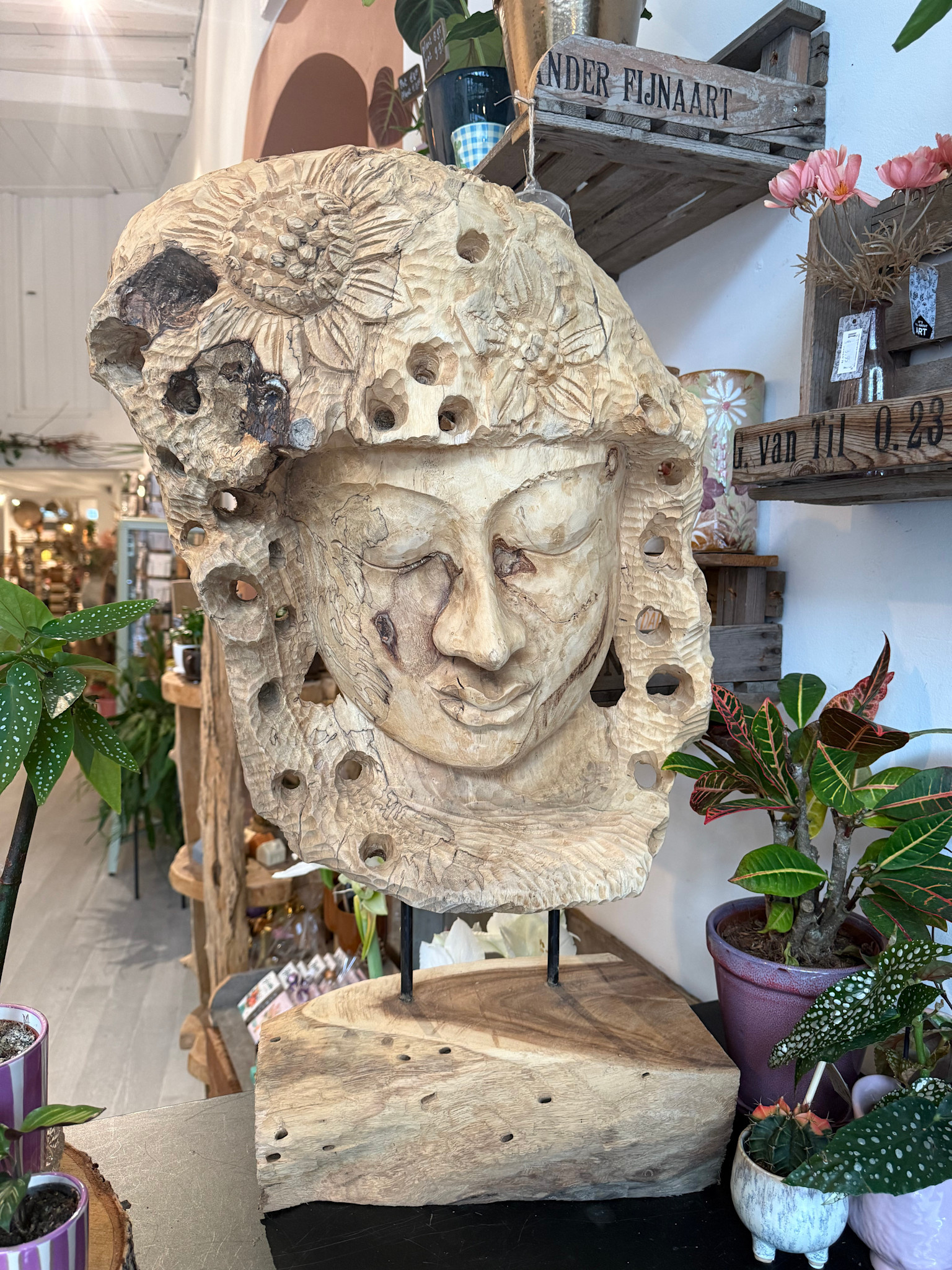 Dit prachtige beeld is handgemaakt van teakhout en schittert door de gedetailleerde bloemenmotieven. Het is een echte eyecatcher en een perfecte, unieke aanvulling voor je interieur!