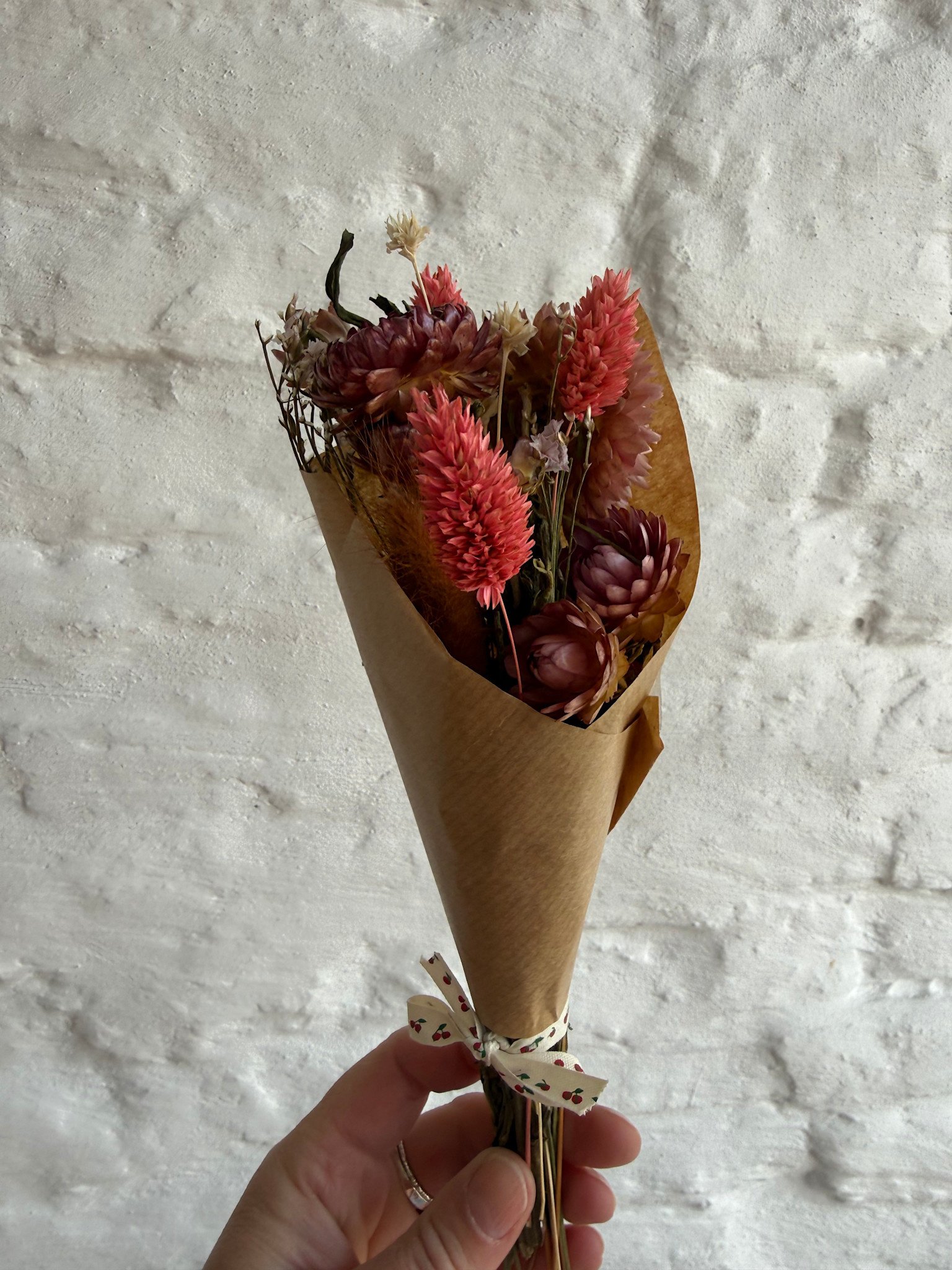 Op zoek naar een lief en origineel cadeautje dat lang mooi blijft? Dit kleine droogbloemen boeketje in zachte roze tinten is perfect om iemand te verrassen. Met zorgvuldig geselecteerde droogbloemen in warme roze, nude en natuurlijke kleuren brengt dit mini boeketje direct sfeer in huis.