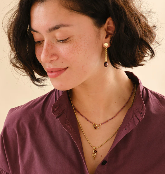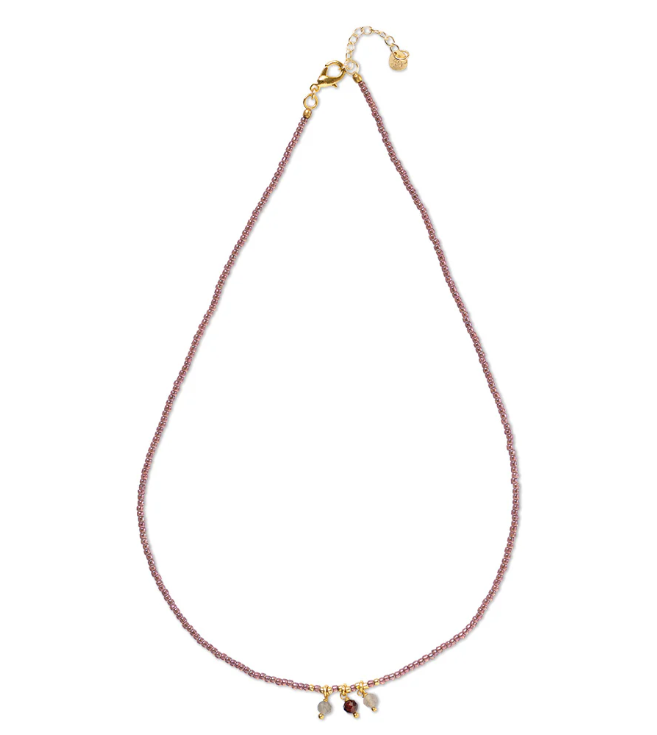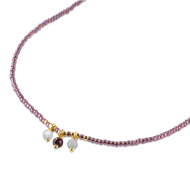 De Empathy Labradoriet Granaat Ketting van A Beautiful Story is een verfijnde en betekenisvolle accessoire. Aan het fijne koord van glaskralen bungelen drie facetgeslepen edelstenen: labradoriet en granaat. Labradoriet straalt intuïtie en reflectie uit, terwijl granaat creativiteit en passie symboliseert. Samen vormen ze een betoverende combinatie van mystiek groen en gloedvol purperrood – een subtiele eyecatcher voor elke gelegenheid.