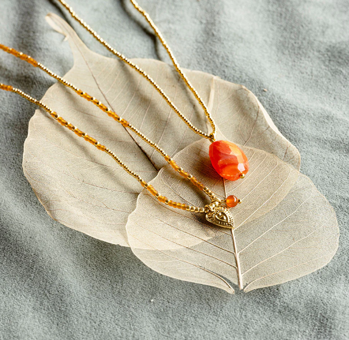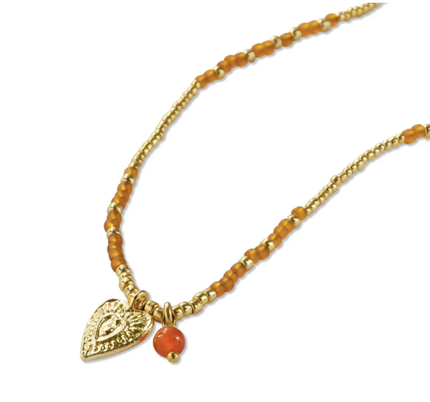 De Honored ketting van A Beautiful Story is een veelzijdige favoriet: je draagt haar als elegante ketting óf driemaal om de pols als armband. De fijne mix van goudkleurige kralen en warme carneool edelstenen geeft een sprankelende, levendige uitstraling. Carneool staat voor moed, creativiteit en transformatie – een steen die je aanspoort om vol vertrouwen in beweging te komen. Het subtiele hartbedel voegt extra symboliek toe: leven met openheid, warmte en lef. Een tijdloos sieraad dat met je meegroeit, elke dag opnieuw.