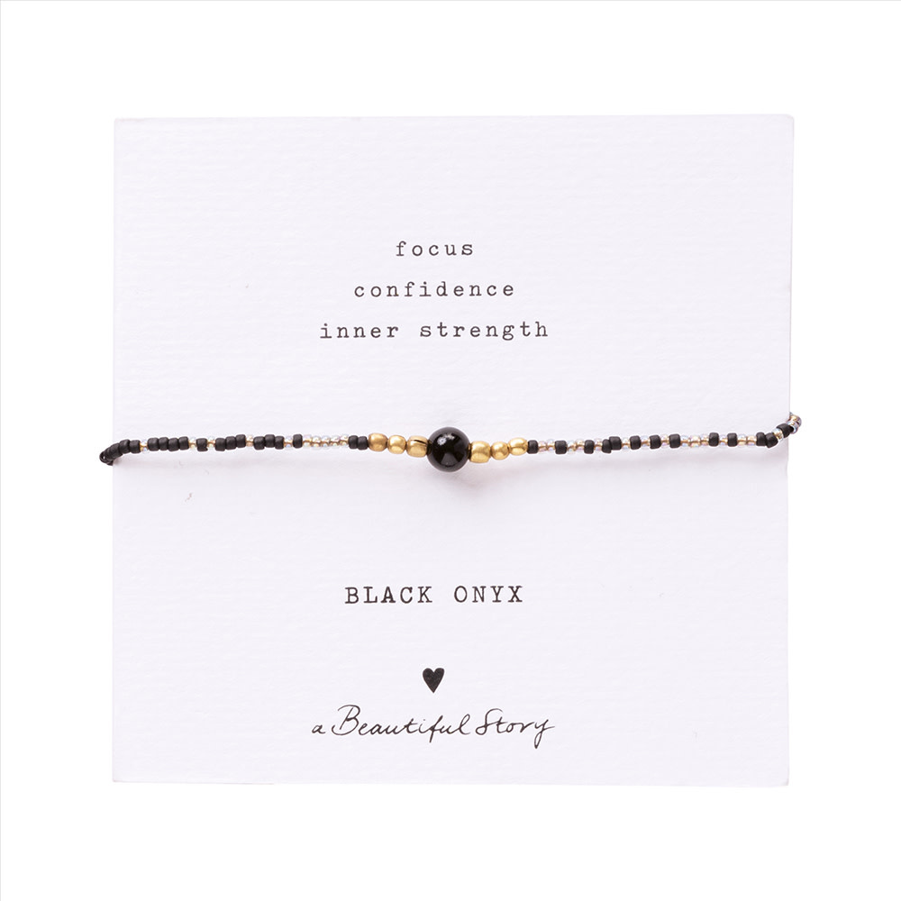 Maak kennis met de Iris Card Zwarte Onyx Goudkleurige Armband van A Beautiful Story. Deze handgemaakte armband is vervaardigd van glaskralen, messing kralen en een kleine zwarte onyx edelsteen. De schuifknoop van katoendraad maakt de armband gemakkelijk verstelbaar, zodat deze altijd de perfecte pasvorm heeft. De armband is bevestigd op een papieren kaart, waardoor het een ideaal cadeau is.