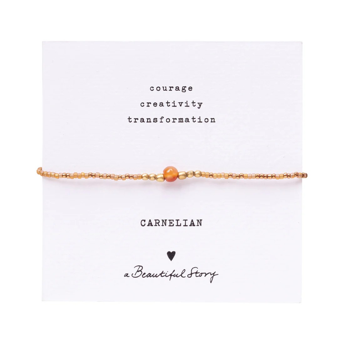 Maak kennis met de Iris Card Carneool Goudkleurige Armband van A Beautiful Story. Deze handgemaakte armband is vervaardigd uit glaskralen, messing kralen en een kleine carneool edelsteen. Het schuifknoopontwerp van katoendraad maakt de armband eenvoudig verstelbaar van 16 tot 22 cm, perfect voor elke pols. De armband is bevestigd op een papieren kaart, waardoor het ook een bijzonder cadeau is.