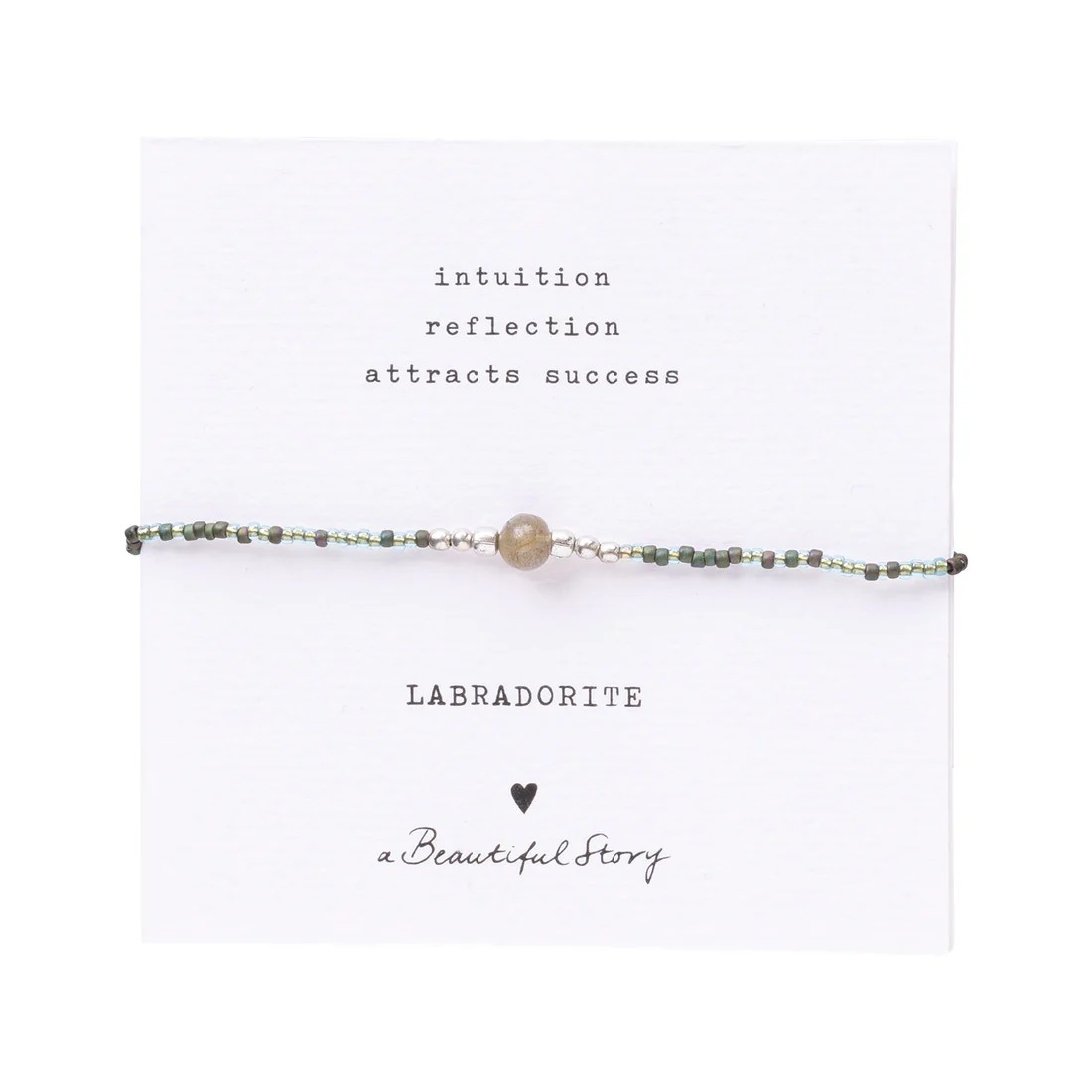 Maak kennis met de Iris Card Labradoriet Zilverkleurige Armband van A Beautiful Story. Deze handgemaakte armband is gemaakt van katoenen draad met glaskralen, messing kralen en een kleine labradoriet edelsteen. De verstelbare schuifknoop zorgt ervoor dat de armband gemakkelijk aan te passen is aan elke pols. De armband is bevestigd op een papieren kaart, waardoor het een prachtig cadeau is.