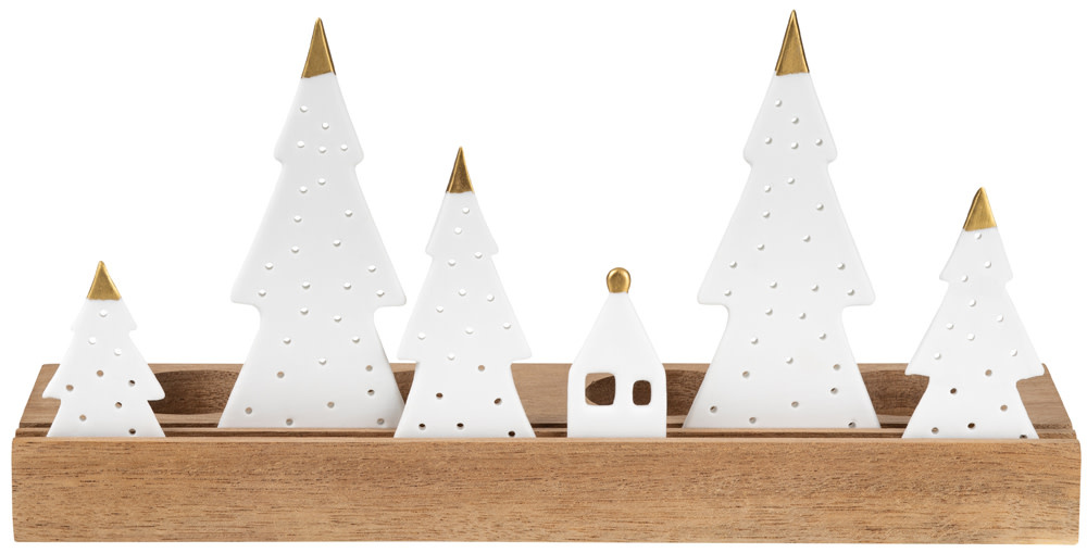 Het Light Object Tree van Räder is een sfeervol wintertafereel dat direct een warm en feestelijk accent aan je interieur toevoegt. De gestileerde boompjes van wit porselein, subtiel geperforeerd voor een zacht lichtspel, staan op een massief houten basis. Samen vormen ze een serene, bijna magische berglandschap-look dat perfect past op een vensterbank, dressoir of gezellig hoekje in huis.