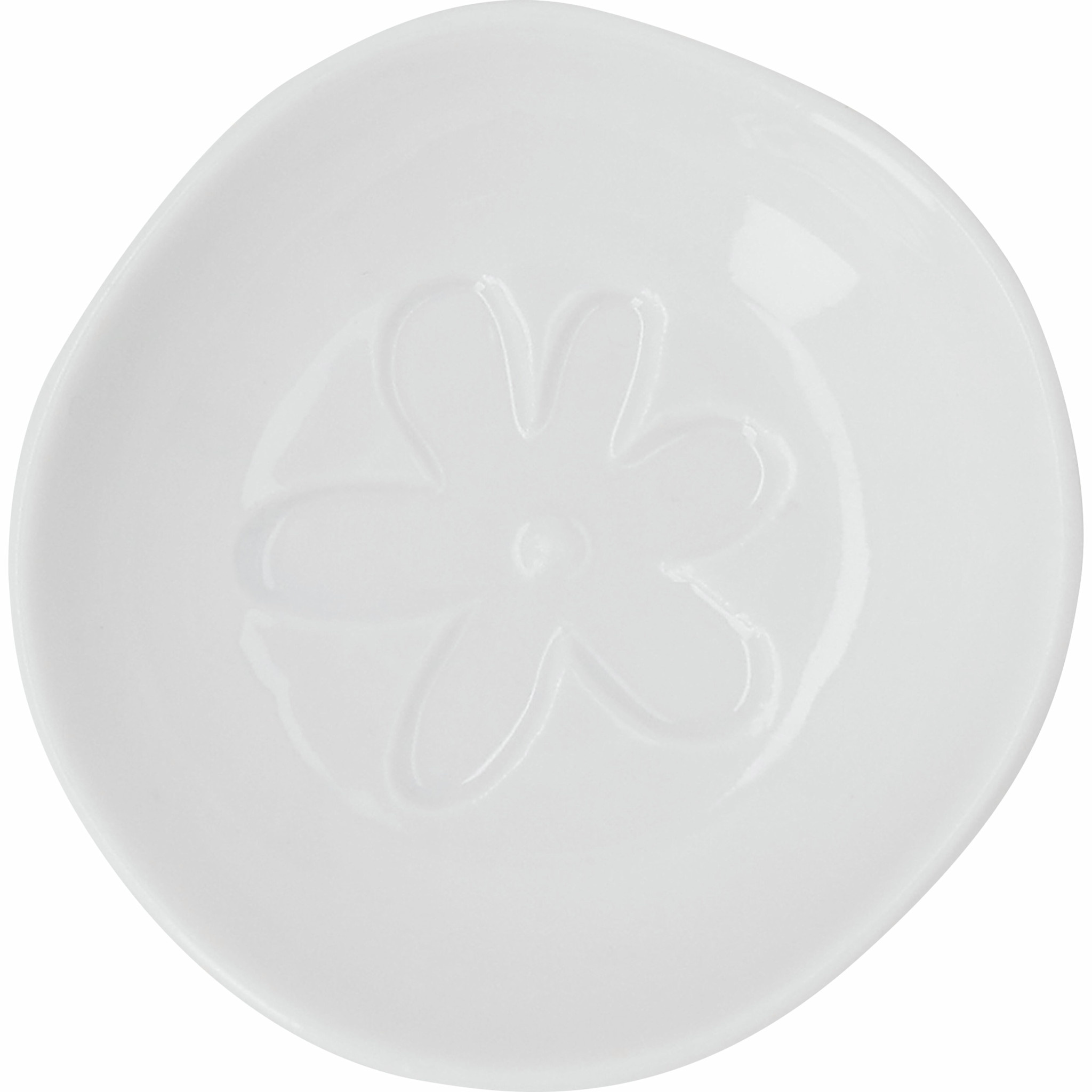 Een klein schaaltje van wit porselein, met in het midden een fijne bloem en subtiele details. Het eenvoudige ontwerp maakt het geschikt voor kleine items zoals sieraden, theezakjes of als decoratief element in huis.