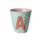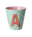 Rice melamine beker met de letter A en bloemetjes print op een mintkleurige achtergrond. Stevig, vro..