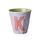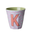 Rice melamine beker met de letter K en bloemetjes print op een zachtpaarse achtergrond. Stevig, vrol..