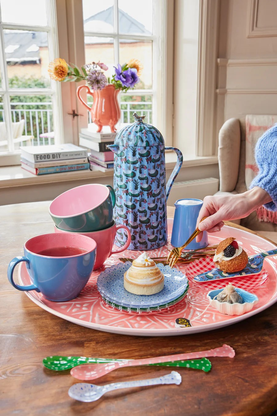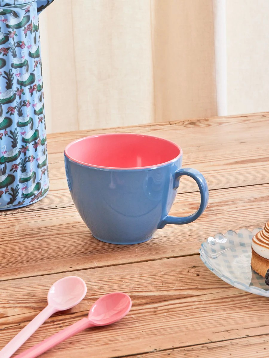 Geniet van je favoriete warme dranken in deze ruime melamine jumbo mok. Met een rustige blauwe kleur aan de buitenkant en een mooie koraalkleur aan de binnenkant, is deze mok perfect voor een kopje thee of warme chocolademelk. Of je nu lekker binnen zit met een dekentje, deze mok voegt comfort en stijl toe aan je moment.