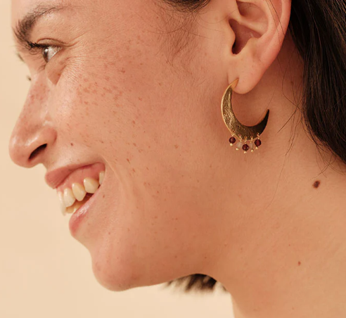 De Mystic oorbellen van A Beautiful Story zijn een betoverende mix van elegantie en symboliek. De halvemaanvormige hangers zijn rijk verguld en versierd met kleine, facetgeslepen edelstenen: diepe granaat en zachte rozenkwarts. Een speels, feestelijk ontwerp dat licht beweegt bij elke stap – perfect voor bijzondere momenten, maar ook als sprankelend detail bij een alledaagse look. Door het handwerk en de natuursteen is ieder paar uniek.