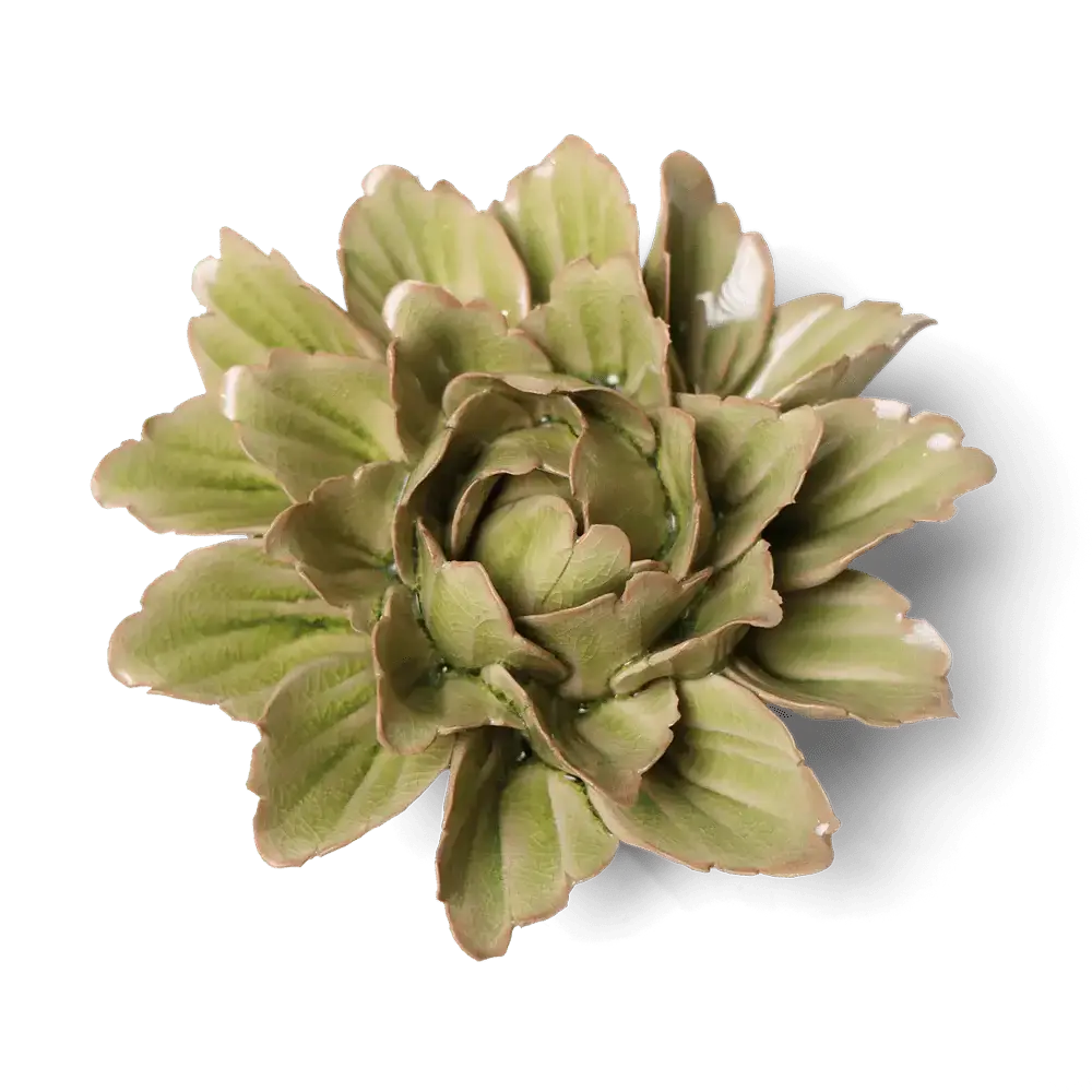 Deze keramische bloem is een echte blikvanger met een speelse, natuurlijke uitstraling. De verfijnde nerven in de blaadjes en de subtiele kleurnuances van groen geven dit stuk een levendig en bijna botanisch karakter. Perfect voor wie houdt van detail en een zachte, rustige sfeer in huis.