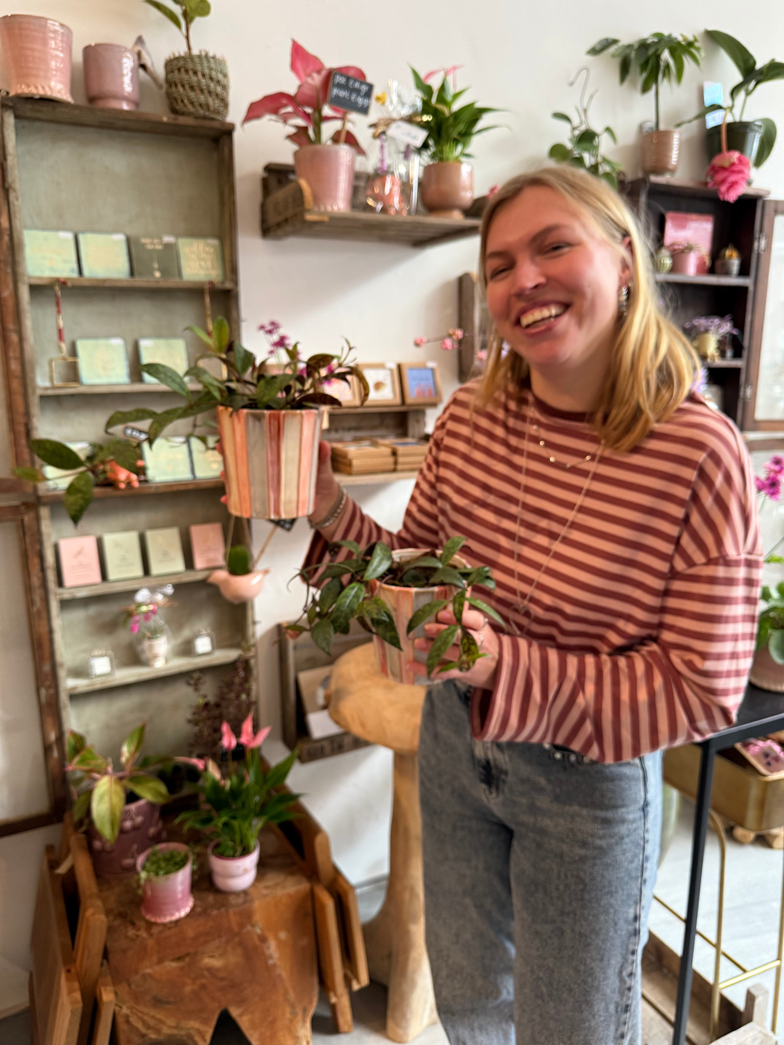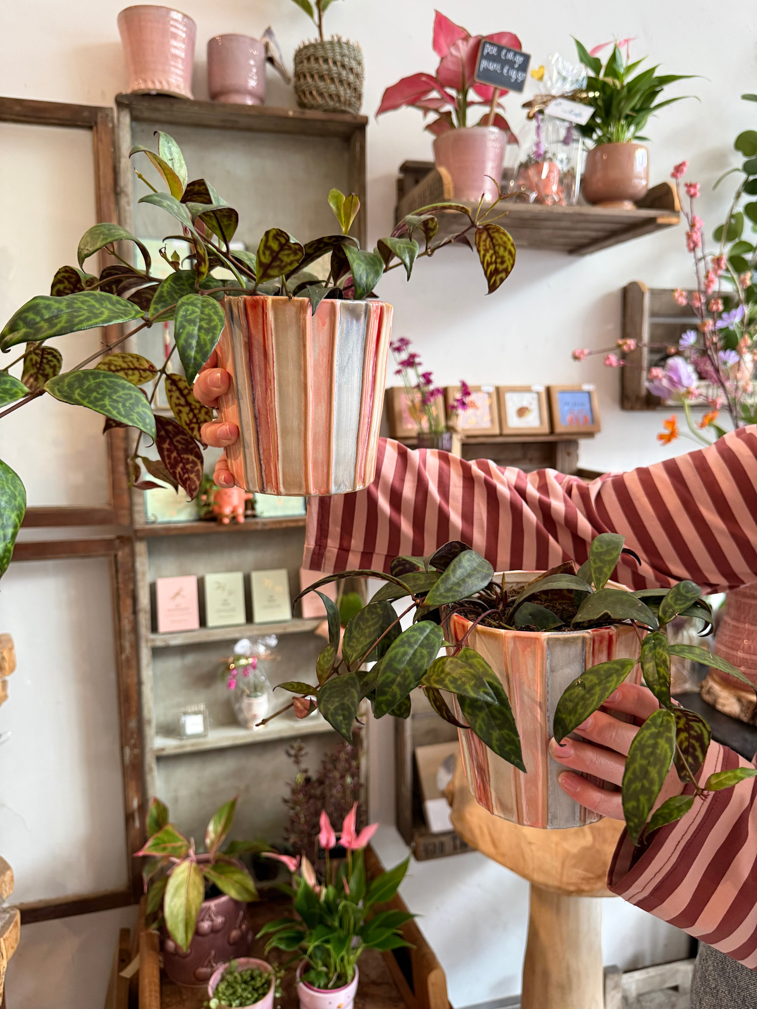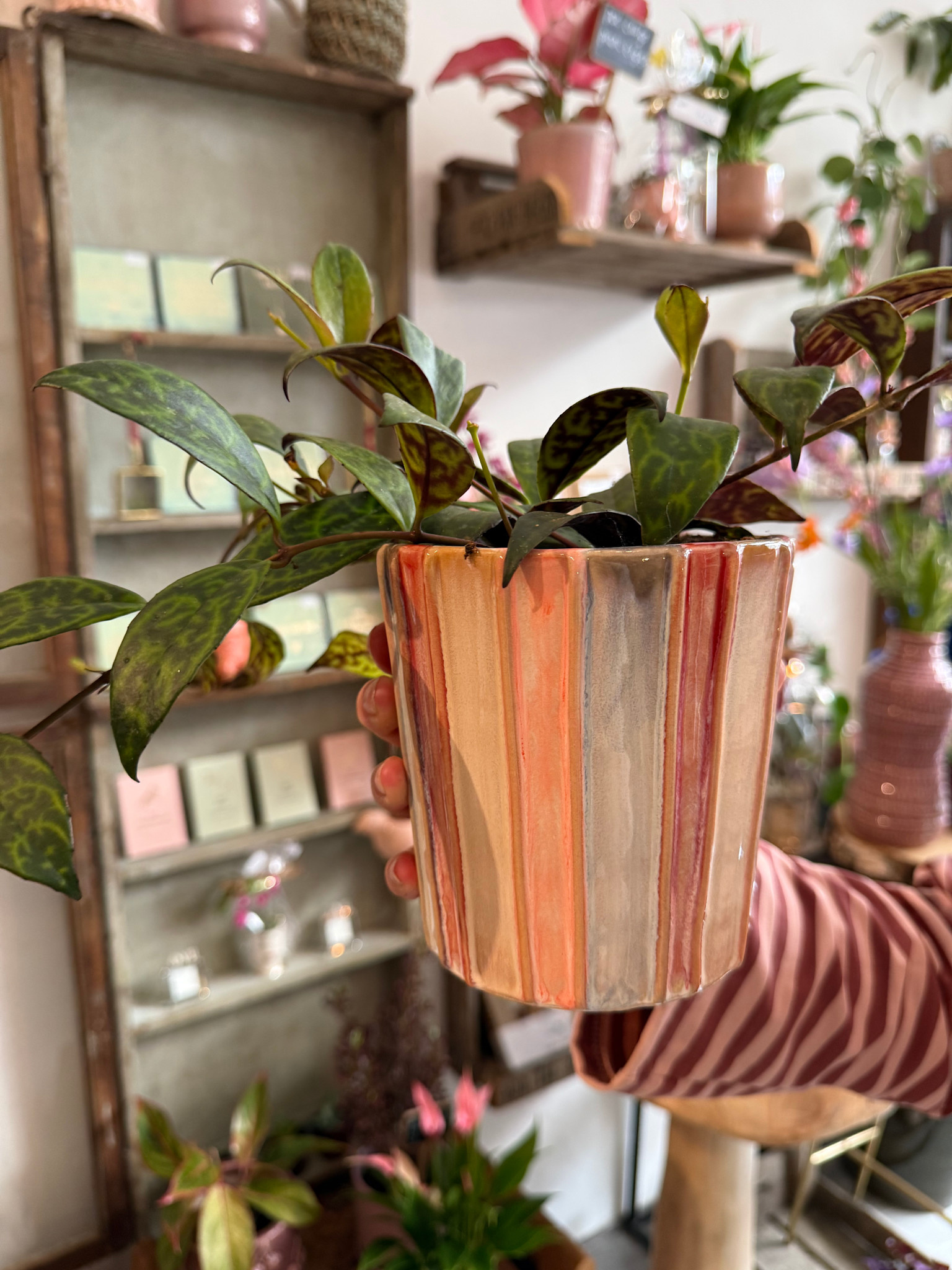 Deze warme keramieken bloempot met zachte strepen in perzik-, roze- en zandtinten geeft direct sfeer aan je interieur. De subtiele glans en het speelse kleurverloop maken elke pot uniek. Perfect voor een klein kamerplantje en mooi te combineren met andere potten voor een gezellig hoekje in huis.