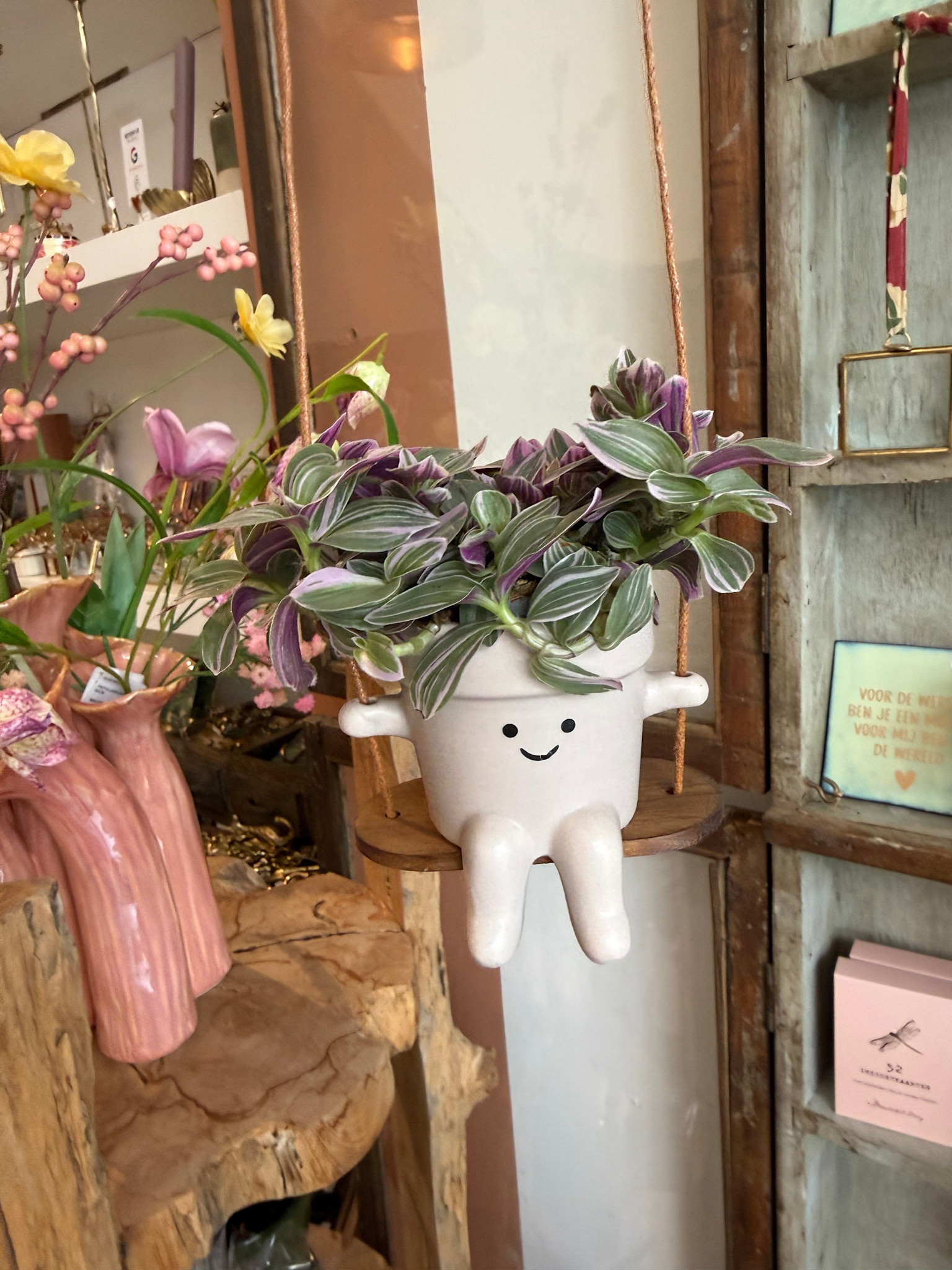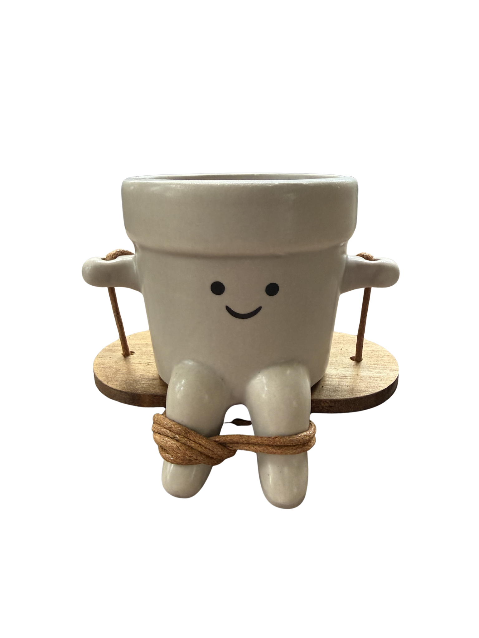 Dit vrolijke schommelende potje tovert meteen een glimlach op je gezicht. Met zijn bungelende beentjes en lieve gezichtje lijkt hij heerlijk te genieten van zijn eigen schommeltje. Perfect voor een klein plantje, stekje of gewoon als decoratief cadeautje.