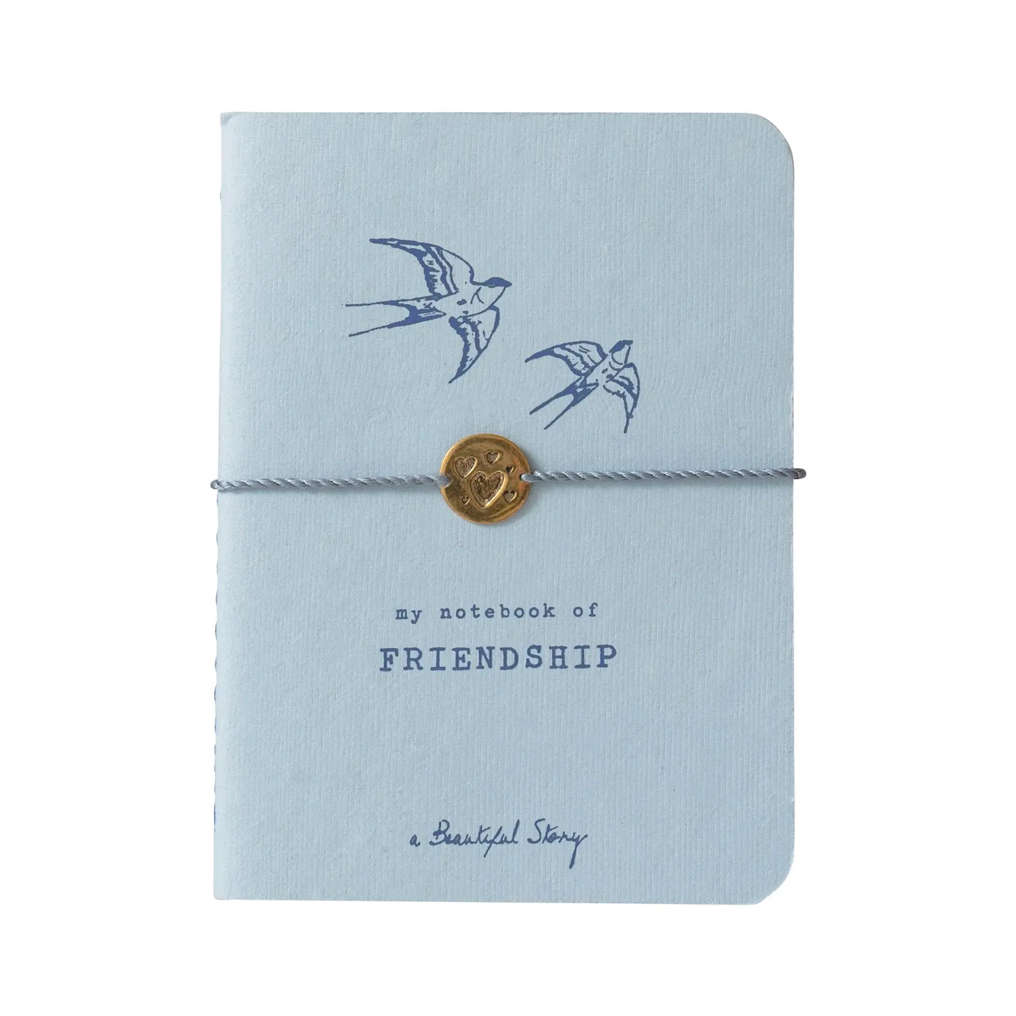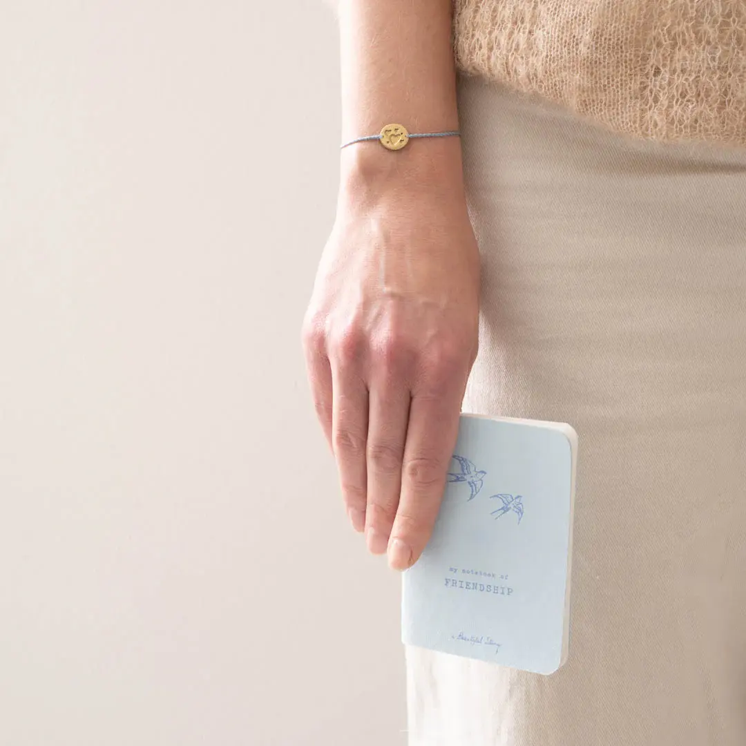Maak kennis met ons Verhalenboek Friendship, een mini-notitieboekje van 72 pagina's. Het armbandje heeft een messing munt met hart symbool. De armband heeft een schuifknoop van katoendraad. Het verhalenboek is 8 cm x 11 cm (A7 formaat).