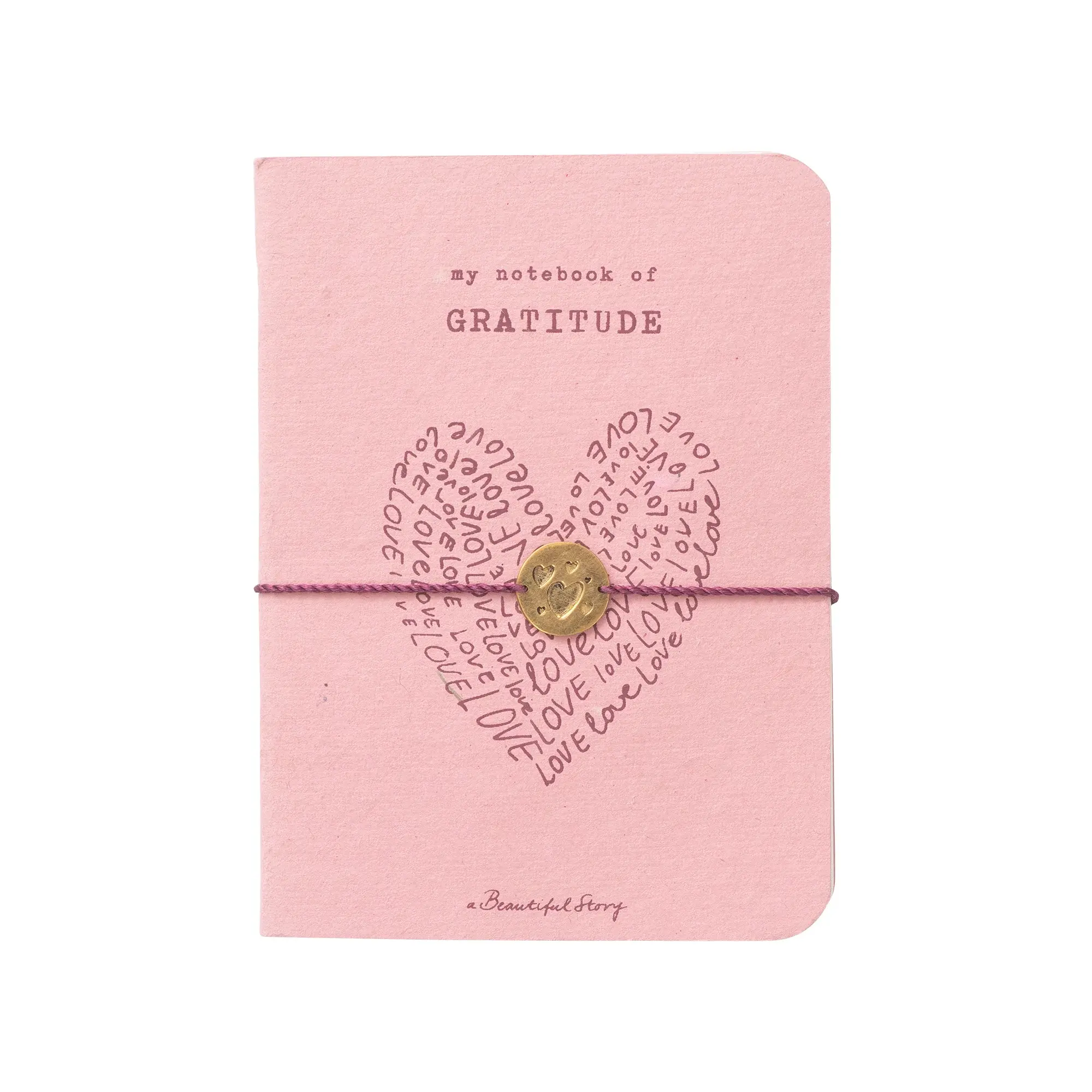 Maak kennis met het Beautiful story Verhalenboek Gratitude. Een mini-notitieboek met 72 pagina's. De armband heeft een messing munt met de een hart symbool en een schuifknoop van katoendraad. Het verhalenboek is 8 cm x 11 cm (A7 formaat). De kaften van al de boekjes zijn gemaakt van gerecycled materiaal. Reststukken uit de kledingindustrie worden omgezet naar deze mooie kaften.