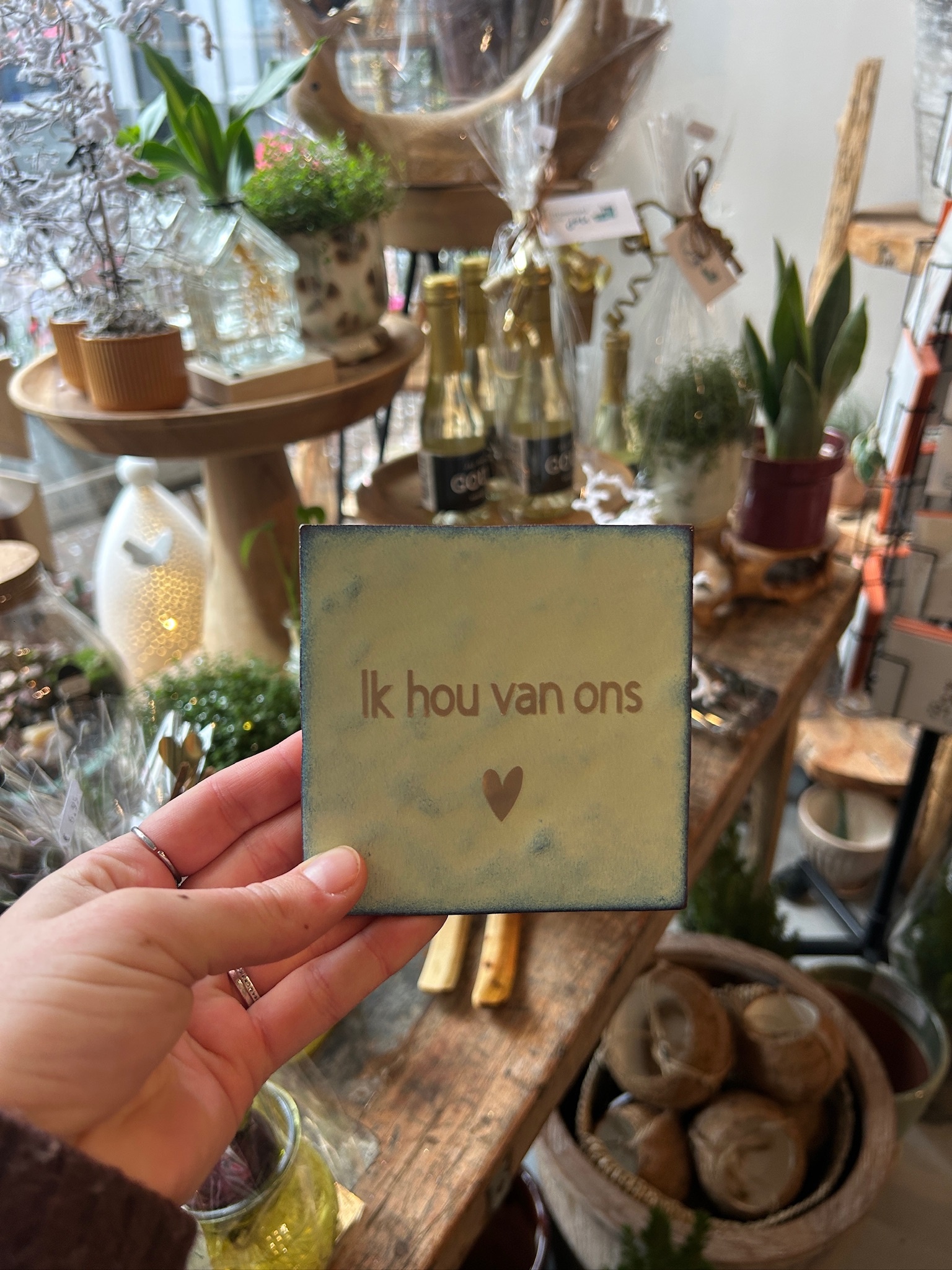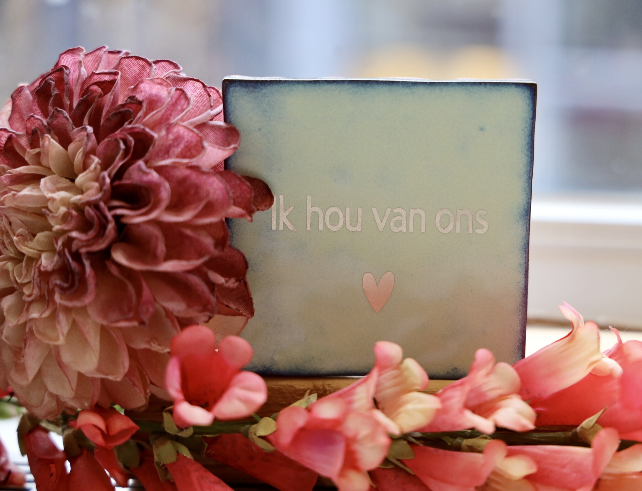 Deze decoratietegel met de tekst ‘Ik hou van ons’ is een liefdevolle reminder aan samen, wij en alles daartussen. Door het rustige kleurverloop en het kleine hartje past dit tegeltje perfect in elk interieur.