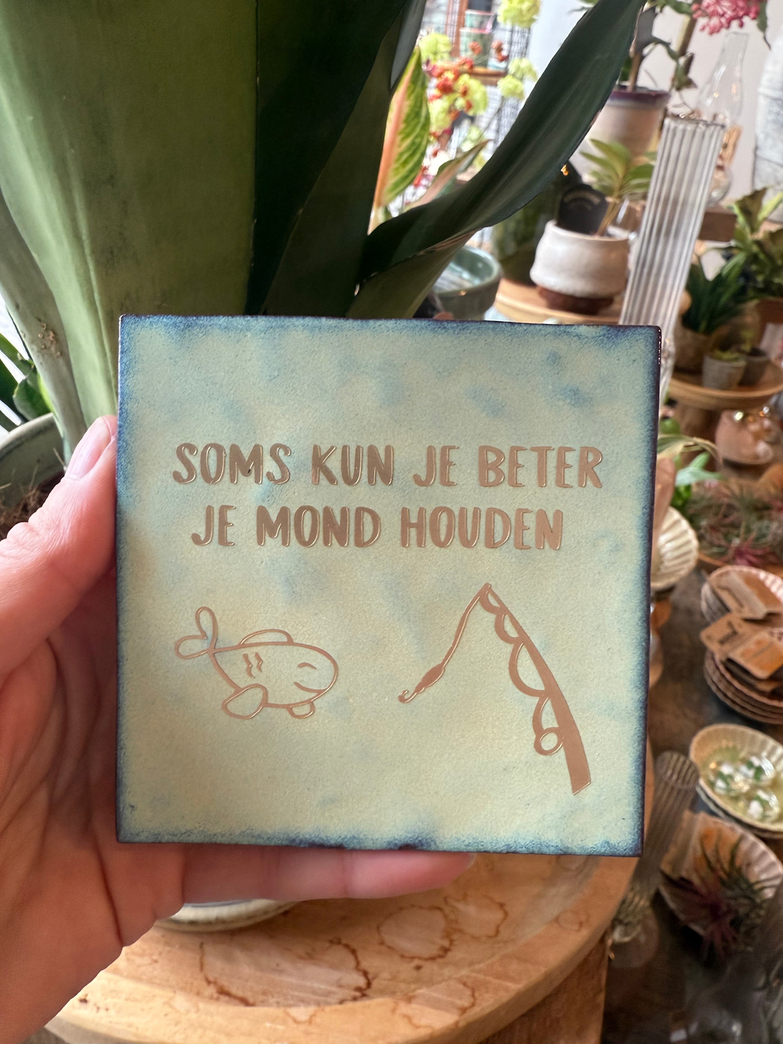 Deze speelse tegel van Mevrouw Potjes brengt humor en een knipoog in huis. Met de tekst “Soms kun je beter je mond houden” en een vrolijke illustratie van een vis en hengel, is dit keramieken tegeltje zowel grappig als decoratief. Een origineel cadeau dat gegarandeerd een glimlach oplevert.