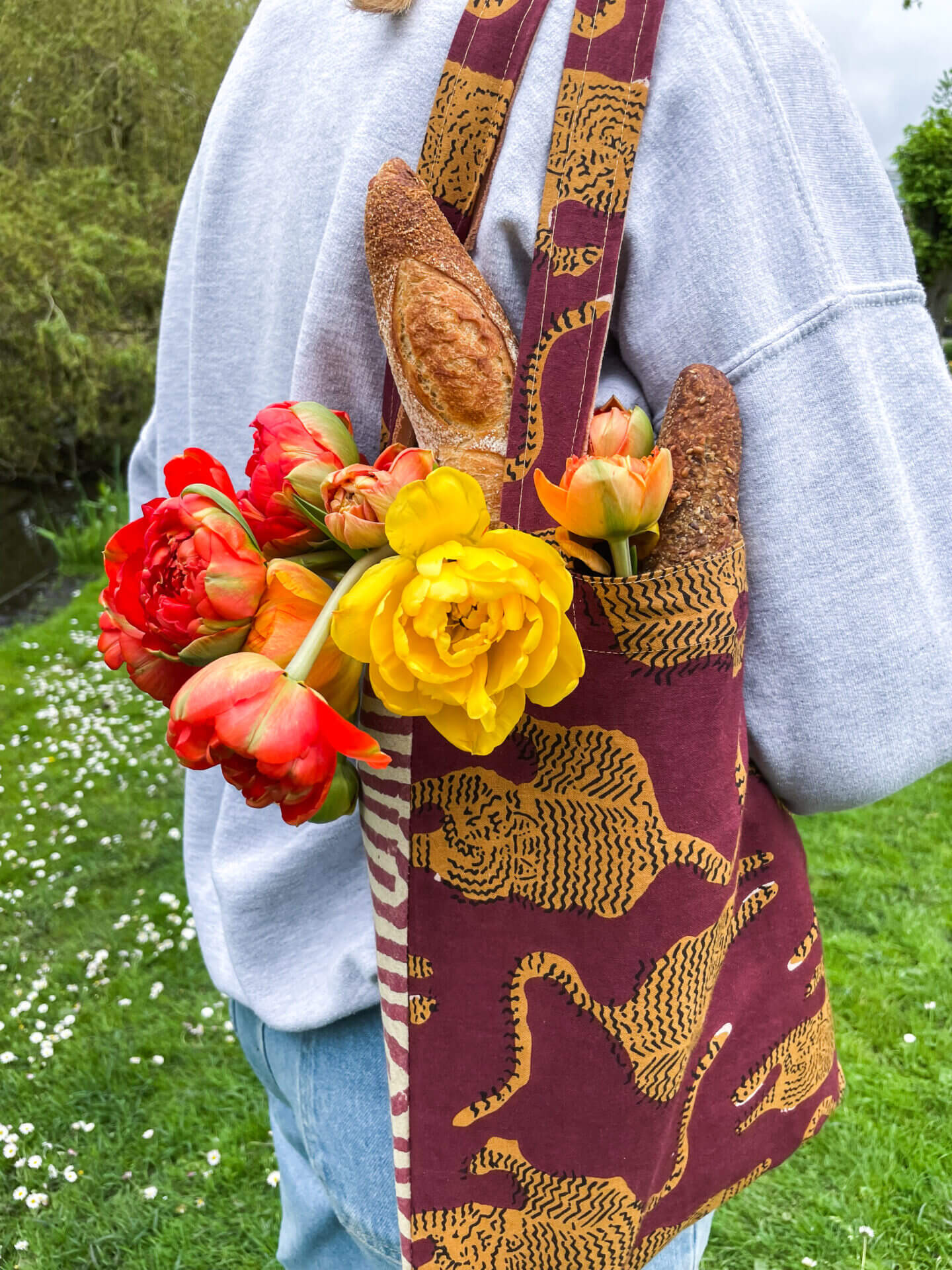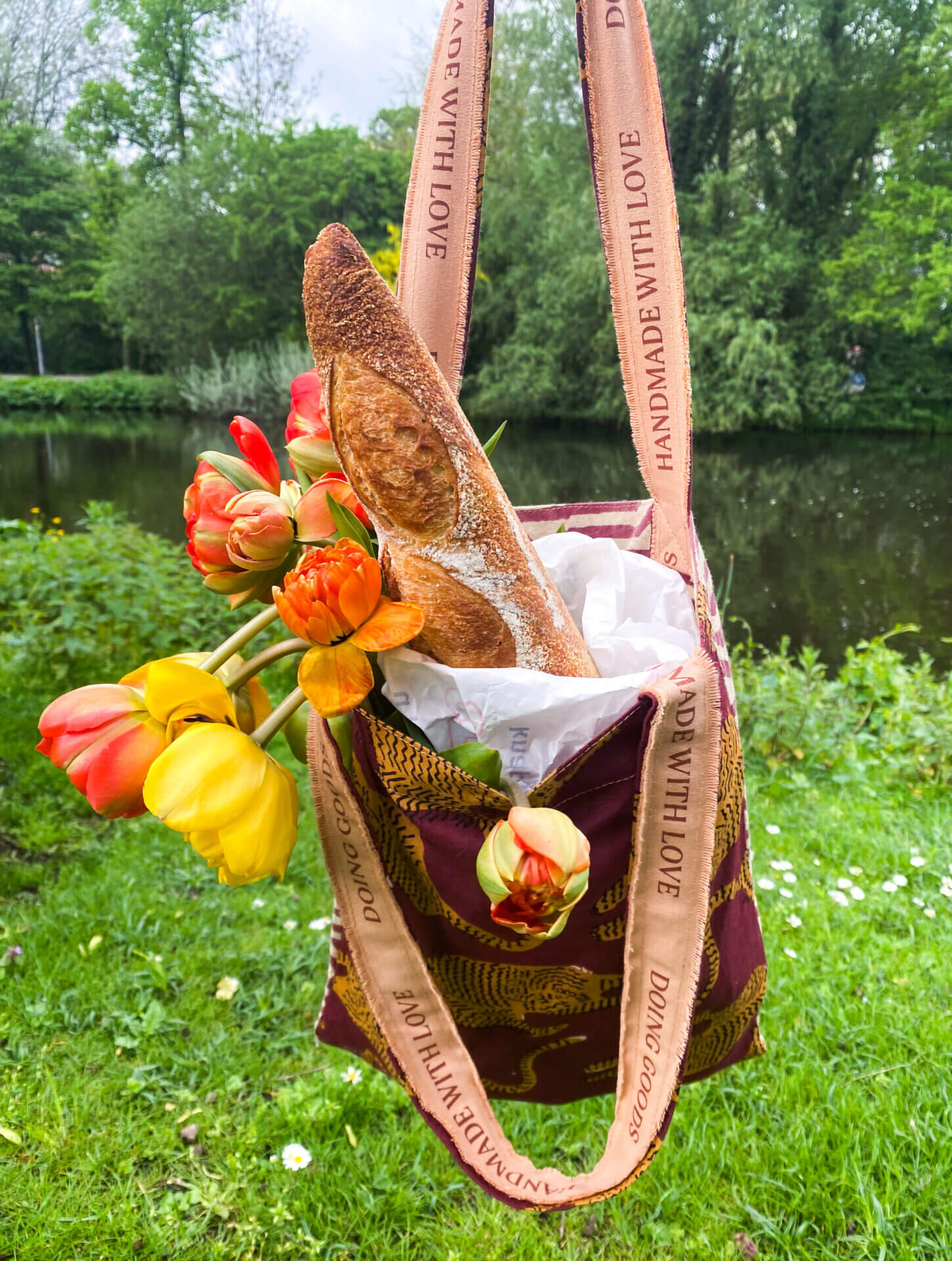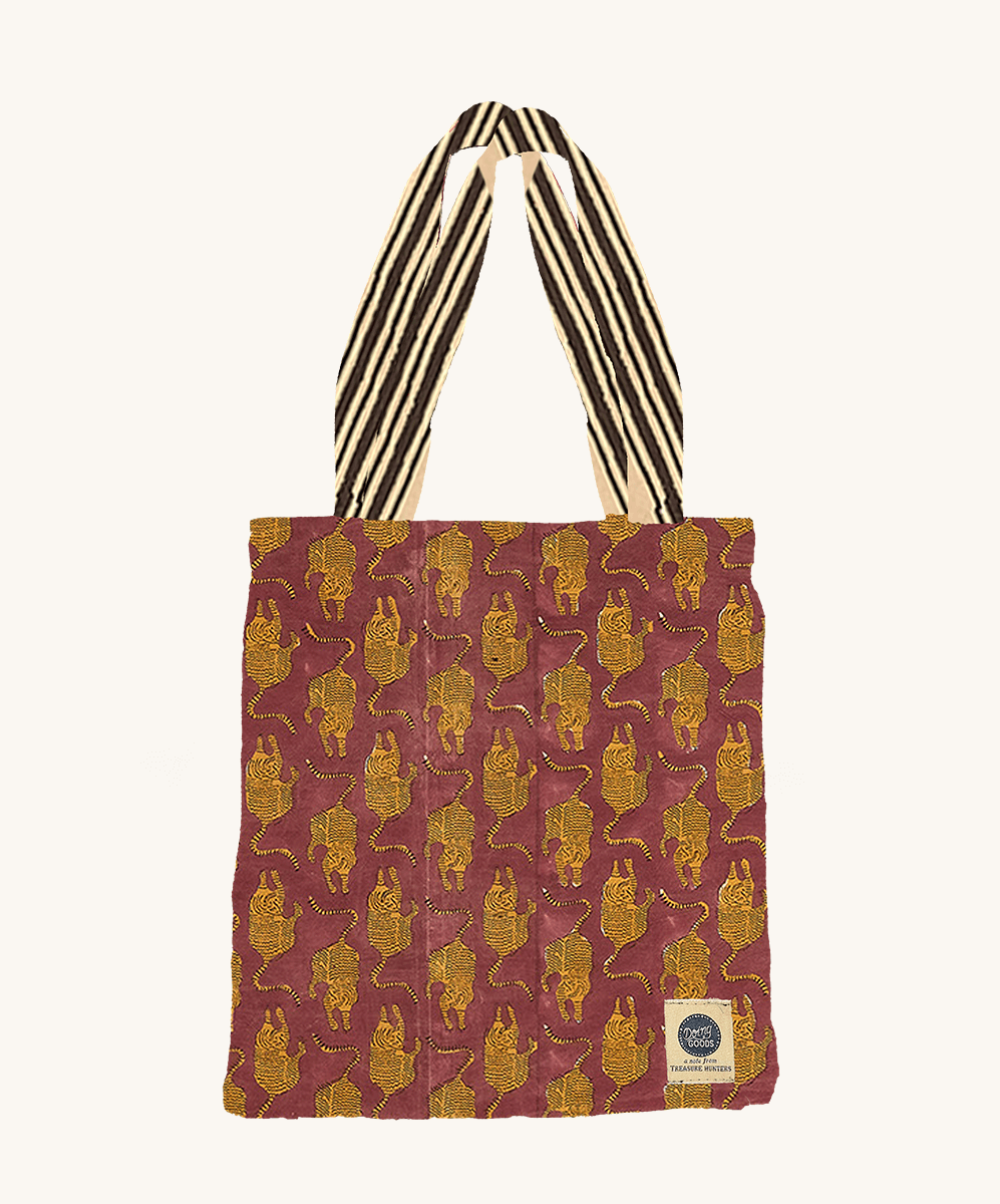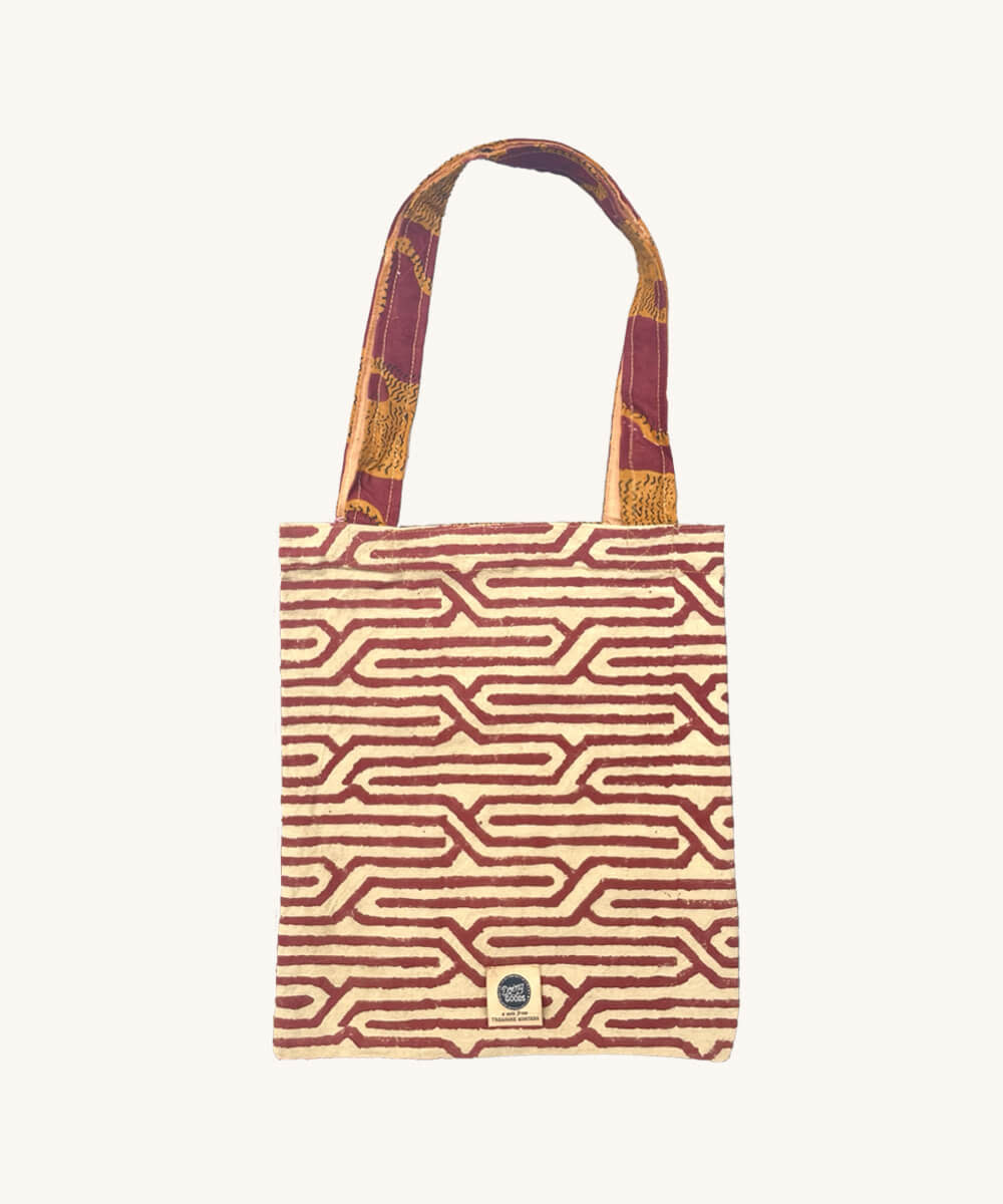 De stof is handbedrukt, kleur voor kleur, met behulp van de langzaamste en nauwkeurigste textieldruktechniek ter wereld: blokdruk. Door de handgemaakte aard heeft elke tas een unieke uitstraling en kunnen er kleine variaties zijn.