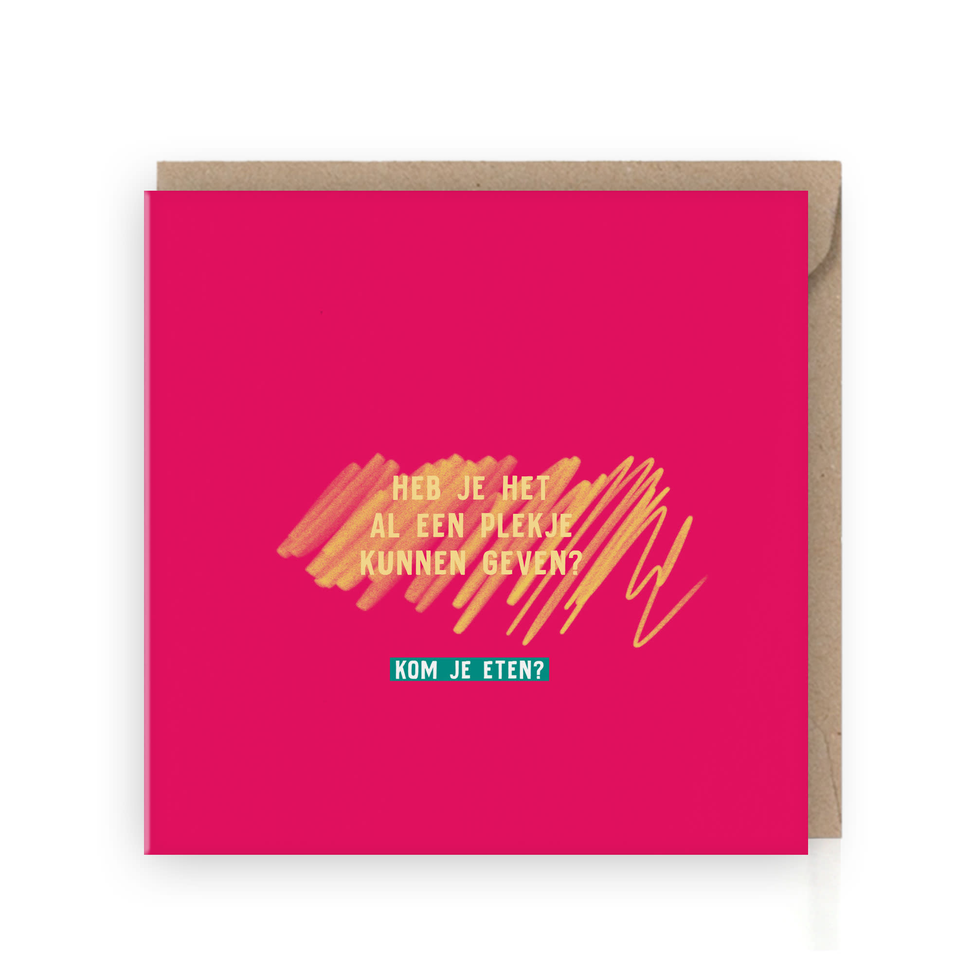 De Wenskaart Kom je eten? (Heb je het al een plekje kunnen geven?) van Grafiquelien is een liefdevol kaartje om iemand nabij te zijn in moeilijke tijden. Met een eenvoudige maar krachtige boodschap laat je weten dat je er bent – zonder dooddoeners, maar met echte aandacht. Een uitnodiging om samen te zijn, te praten of juist stil te zijn, en zo het verdriet of de last een beetje lichter te maken.