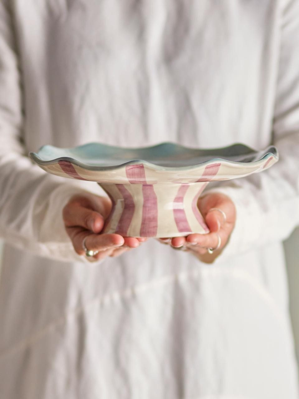 De Willa Taartschaal van Bloomingville is een speels en stijlvol pronkstuk op elke tafel. De pastelkleurige schaal heeft een zachte blauwe bovenkant en een voet met roze gestreept patroon – allemaal met de hand beschilderd. De golvende rand geeft de schaal een vrolijk accent en maakt ‘m perfect voor het serveren van taarten, koekjes en andere lekkernijen.