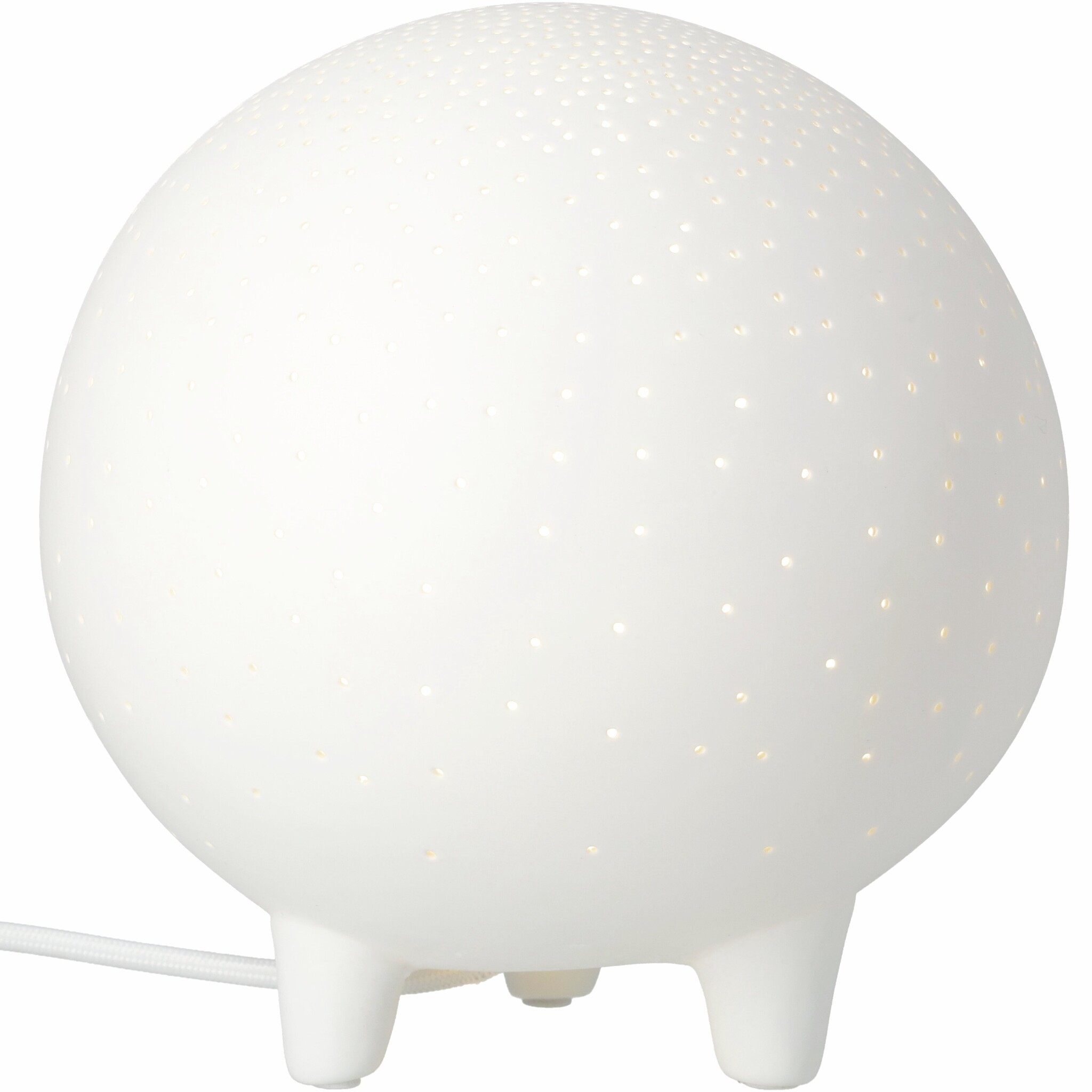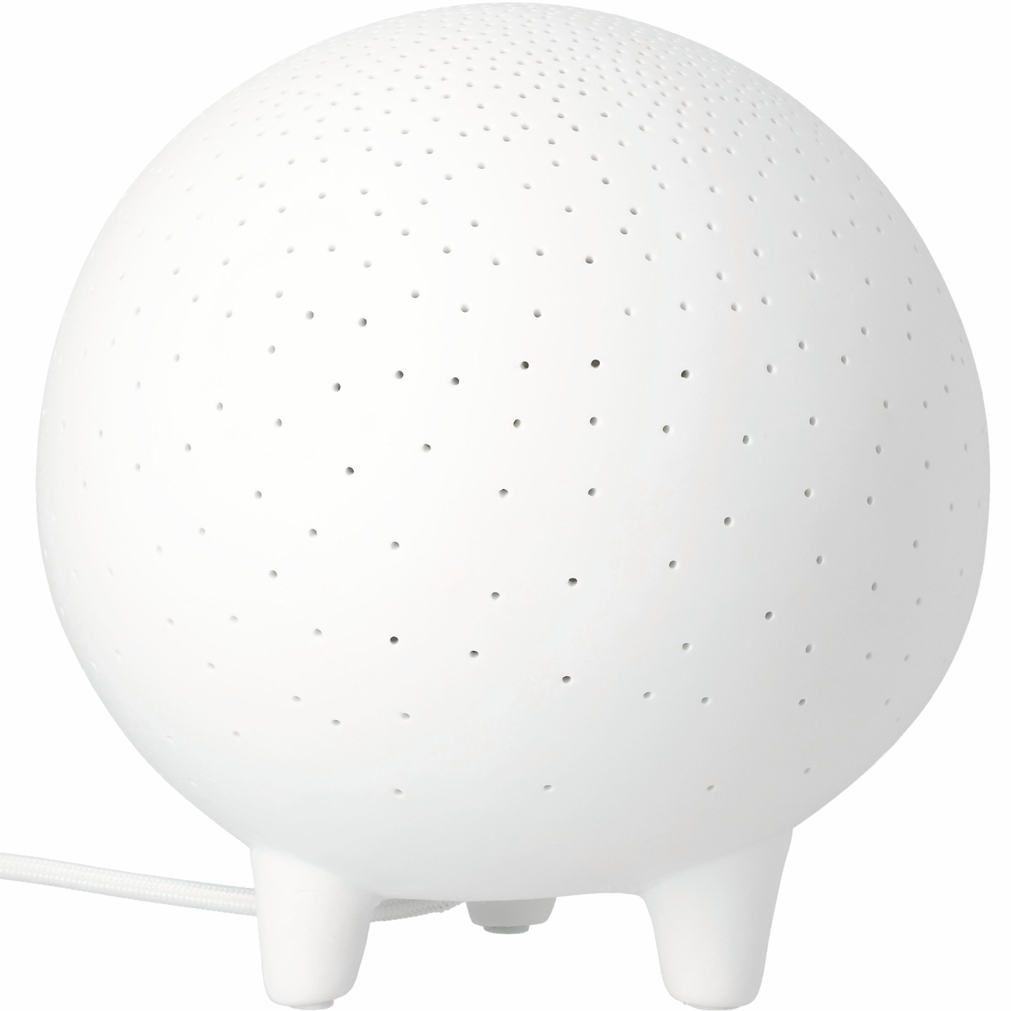 De World of Wonders Light van Räder is een betoverende tafellamp van mat wit porselein, ontworpen om een zacht en dromerig lichtspel te creëren. De kleine, gelijkmatig verdeelde perforaties laten het licht subtiel door, alsof je naar een sterrenhemel kijkt. Dankzij het ronde silhouet en de minimalistische pootjes oogt de lamp zowel speels als elegant – een stijlvolle sfeermaker voor op een dressoir, nachtkastje of in de kinderkamer.