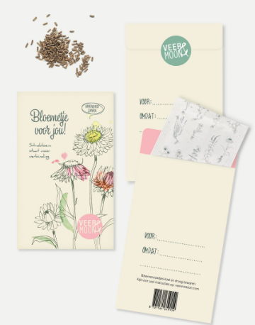 Met het zadenzakje Bloemetje voor jou van Veer & Moon geef je een klein gebaar vol betekenis. Het zakje bevat zaden van de strobloem, een bloem die staat voor verbinding. Zo zet je iemand letterlijk en figuurlijk in de bloemen. Op de achterzijde is ruimte om de naam van de ontvanger te schrijven en de reden waarom je dit zakje schenkt. Een vrolijk cadeautje om te geven of te versturen.