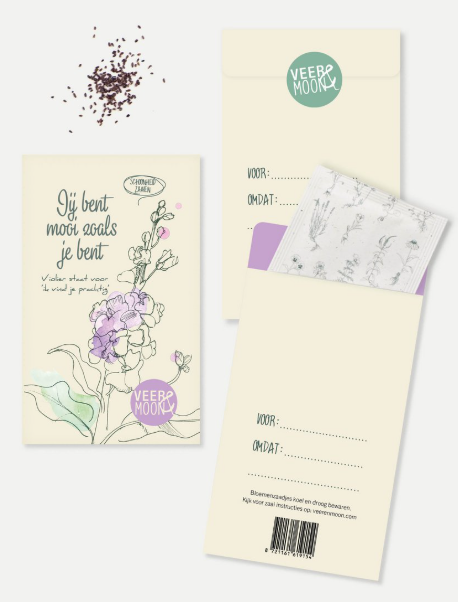Het zadenzakje Jij bent mooi zoals je bent van Veer & Moon is een liefdevol en betekenisvol cadeautje. Het bevat zaden van de Violier, een bloem die symbool staat voor ik vind je prachtig. Daarmee geef je iemand een compliment dat altijd goed doet: “jij bent mooi zoals je bent”. Op de achterzijde kun je de naam van de ontvanger schrijven en de reden waarom je dit zakje schenkt. Een klein, maar hartverwarmend gebaar om te geven of te versturen.