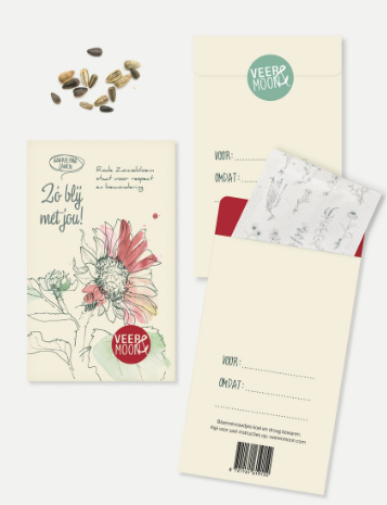 Het zadenzakje Zó blij met jou van Veer & Moon is een bijzonder en betekenisvol geschenk. Het bevat zaden van de Rode Zonnebloem, een bloem die symbool staat voor respect en bewondering. Op de achterzijde kun je de naam van de ontvanger schrijven en de reden waarom je dit zakje geeft. Een klein gebaar met grote betekenis – ideaal om te geven of te versturen.